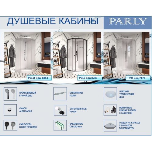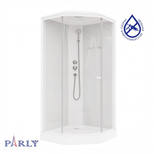 Душевая кабина, низкий пентагональный поддон, верхний душ, ручной душ, полочка, передние стекла прозрачные, задние стекла белые, белый профиль, БЕЗ ПУЛЬТА.