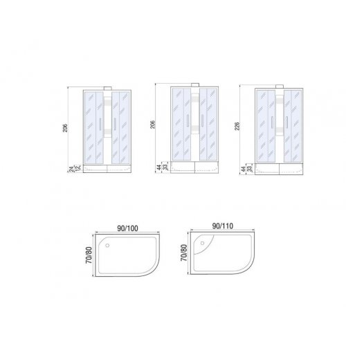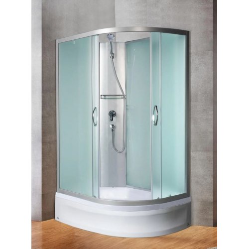 Комплектация: без крыши; цент. стойка; ручной душ 3-х позиц.; держатель д/лейки; смеситель из латуни с керамич. картриджем; полочка; поддон п/кр низ.со/съемн. экр.(Н=26см); cифон