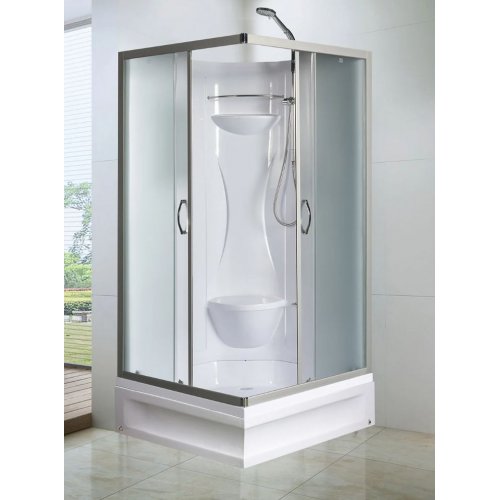 Без крыши, штанга, ручной душ, смеситель, зеркало, полочки (2шт), сиденье, матовое или тонированное стекло