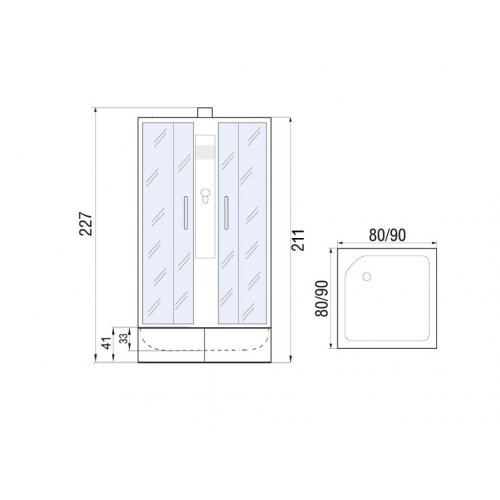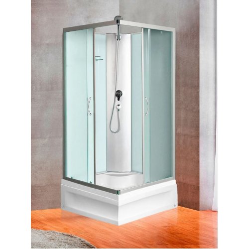 без крыши, центр.стойка, держатель для душа, ручной душ 3-х позиционный, смеситель, полочка, зеркало, поддон кв.низ со съемн.экр. (Н=24см), сифон, матовое стекло.