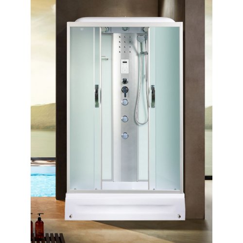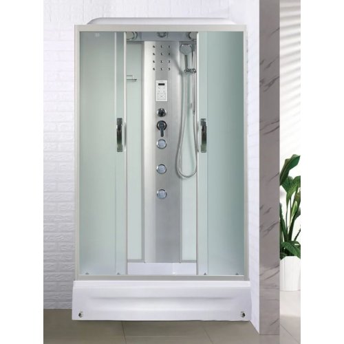 Крыша,верхний душ, верх.свет, декор.подсв, динамик, вентилятор, пульт упр-я, радио, телефон, 3 г\м форсунок, руч.душ 3х режимный, смеситель, переключатель режимов, зеркало, полочка без полотенцедержателя, штанга, стекло матовое или тонированное.