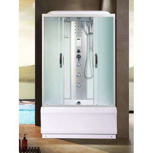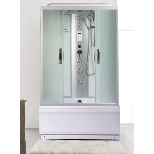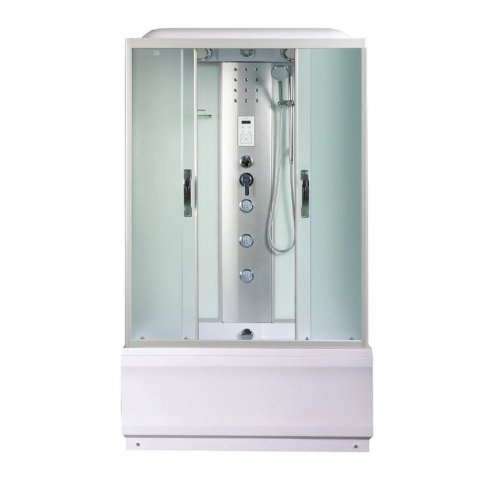 Крыша,верхний душ, верх.свет, декор.подсв, динамик, вентилятор, пульт упр-я, радио, телефон, 3 г\м форсунок, руч.душ 3х режимный, смеситель, переключатель режимов, сиденье,вешалка, зеркало, полочка без полотенцедержателя, штанга, стекло матовое или тонированное.